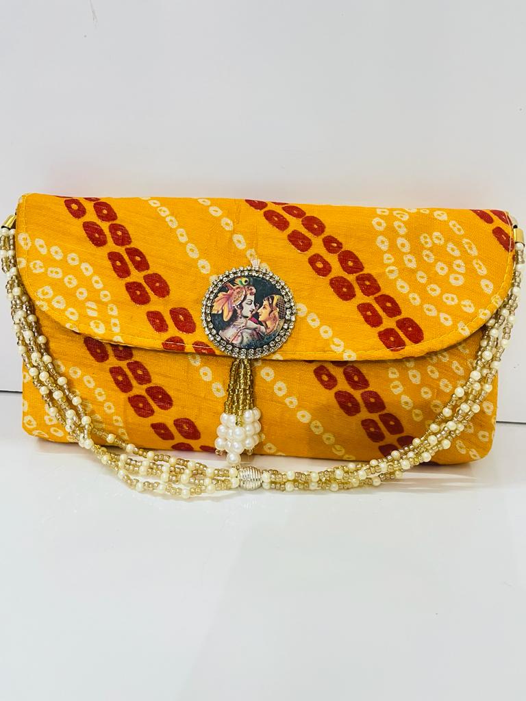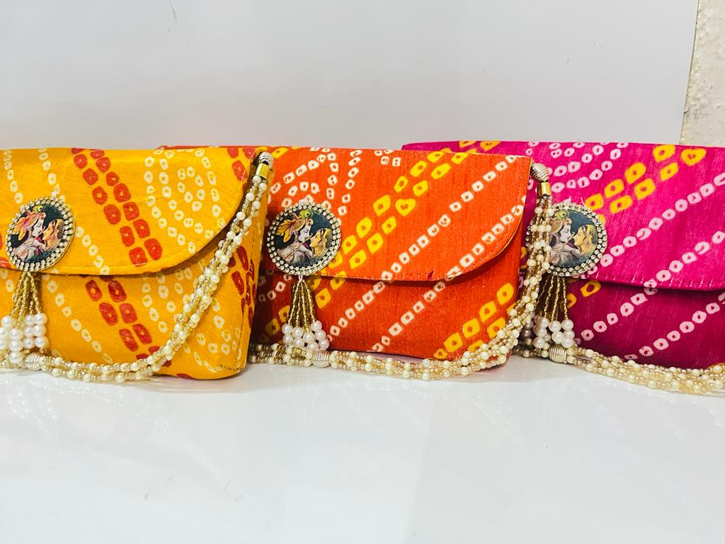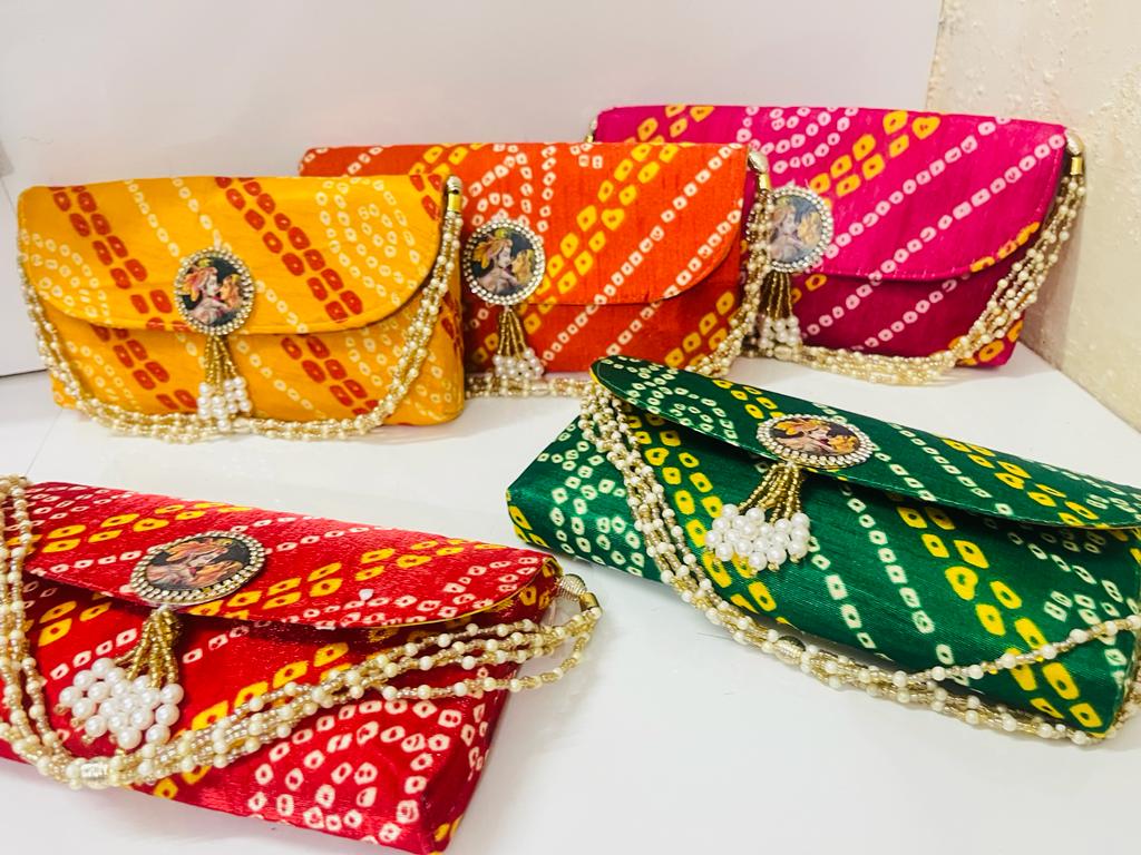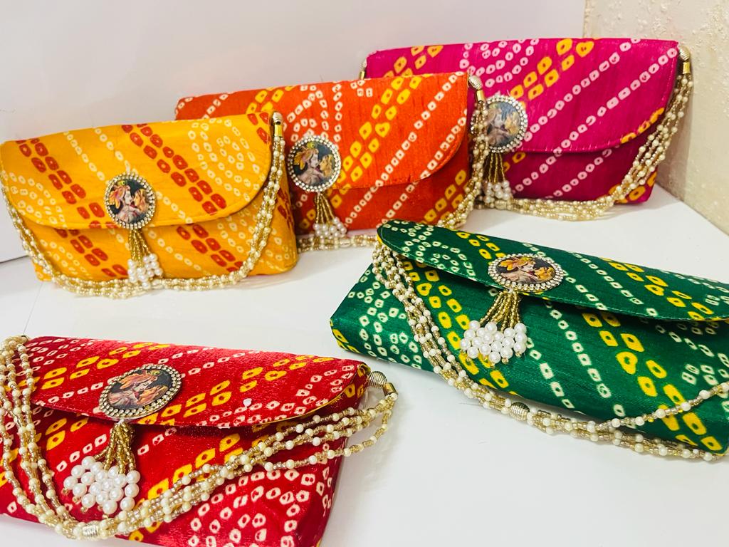 Multicolored Bandhej Fabric Clutches for Wedding Favors | Fabric Clutch with Radha Krishna Brooch & Latkan