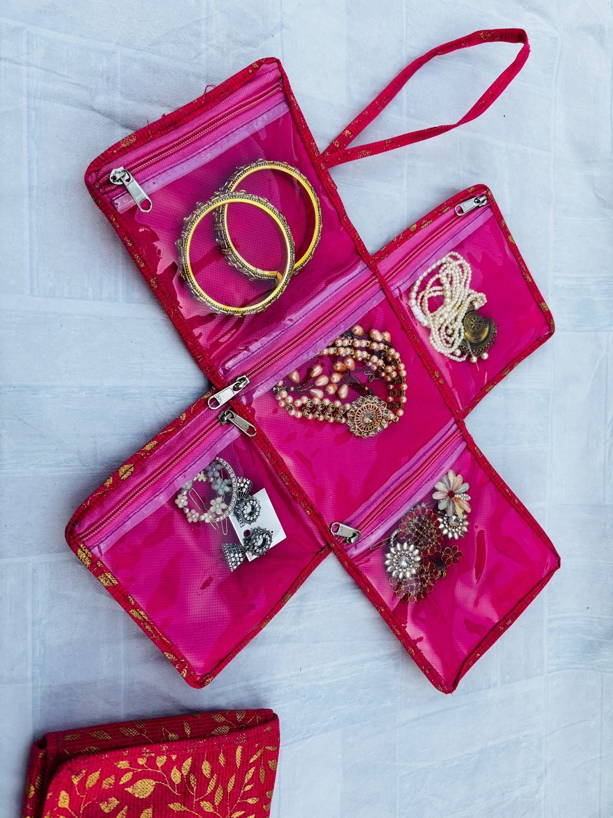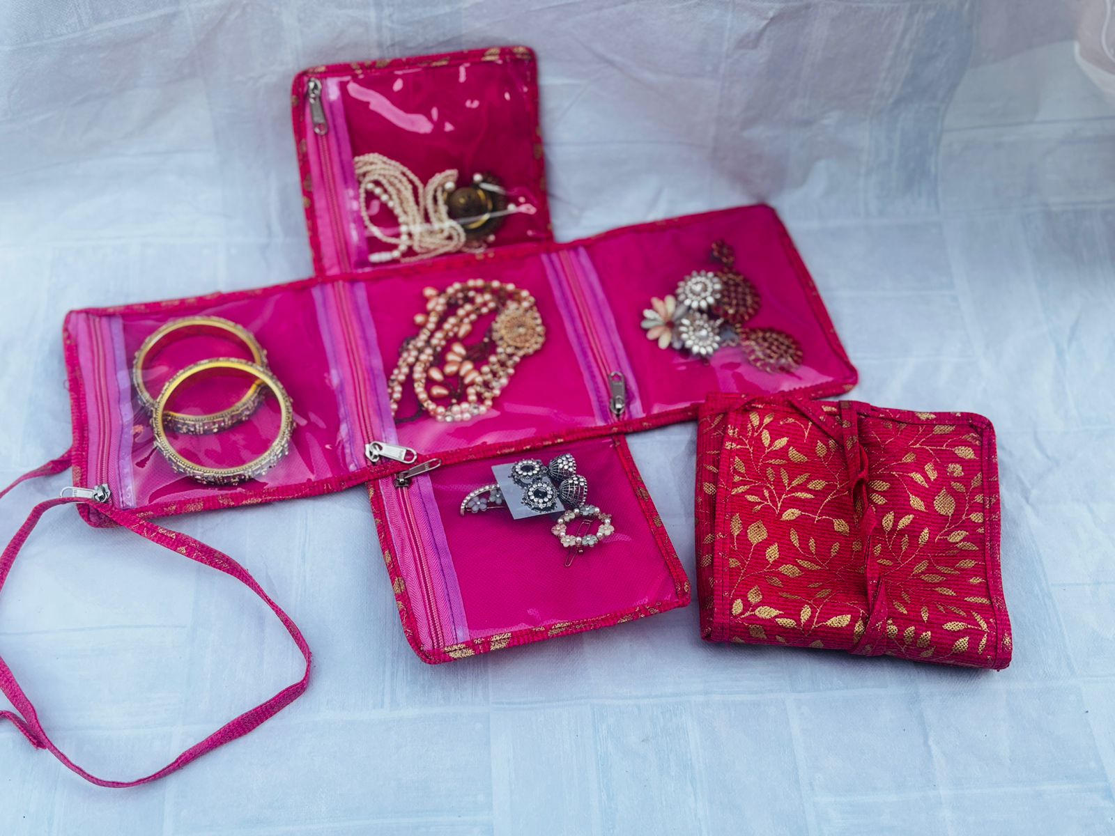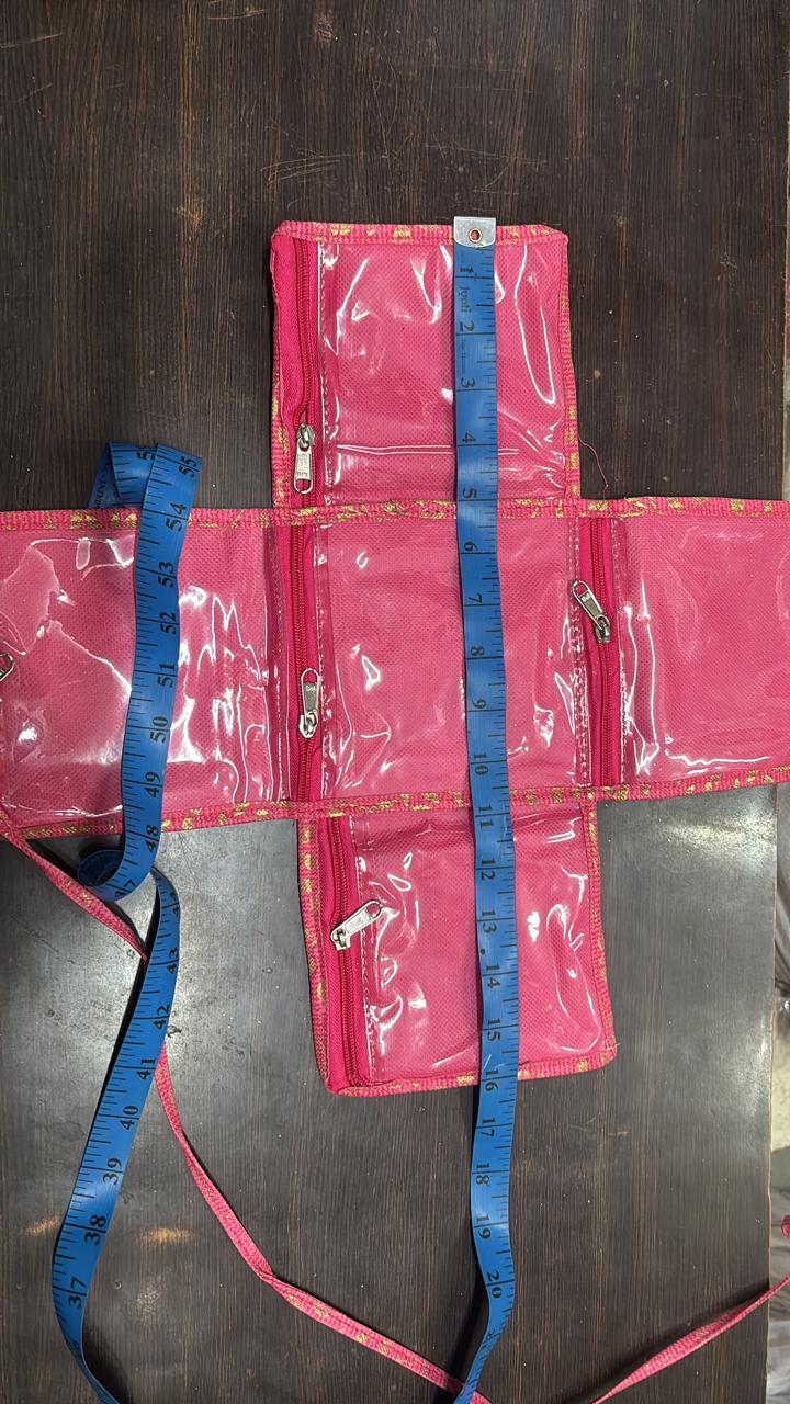 Introducing our brand-new Folding Jewellery Organizer – crafted with vibrant fabric and transparent zip pockets, it’s the perfect blend of elegance and utility. Whether you’re traveling, attending a function, or just want a tidy dressing space, this compact organizer is your go-to solution.